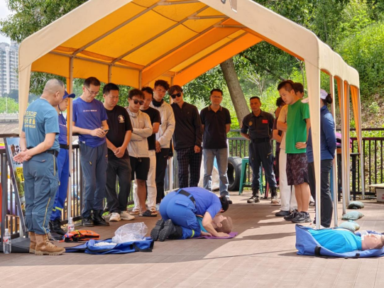 藍(lán)天救援隊(duì)結(jié)合近期發(fā)生的溺水和救援案例,現(xiàn)場拆解“黃金四分鐘”,他們帶領(lǐng)景區(qū)和經(jīng)營業(yè)態(tài)工作人員分組練習(xí),從清理呼吸道、開放氣道到精準(zhǔn)按壓,逐一糾正手勢偏差。全域覆蓋從“專業(yè)隊(duì)”到“全員兵”的安全共識(shí)。接著,槳板運(yùn)動(dòng)協(xié)會(huì)與藍(lán)天救援隊(duì)分別對(duì)槳板救援、繩包救援、徒手救援等進(jìn)行了系統(tǒng)化的培訓(xùn),景區(qū)內(nèi)各業(yè)態(tài)的工作人員也積極地參與了救援實(shí)踐的學(xué)習(xí)。
